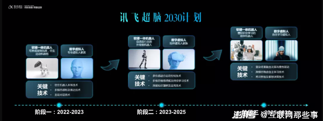 讯飞超脑2030计划共分为三个阶段,而且每个阶段都会围绕“懂知识、善学习和能进化”,分阶段地实现软硬一体机器人和数字虚拟人的智能迭代、壮大。