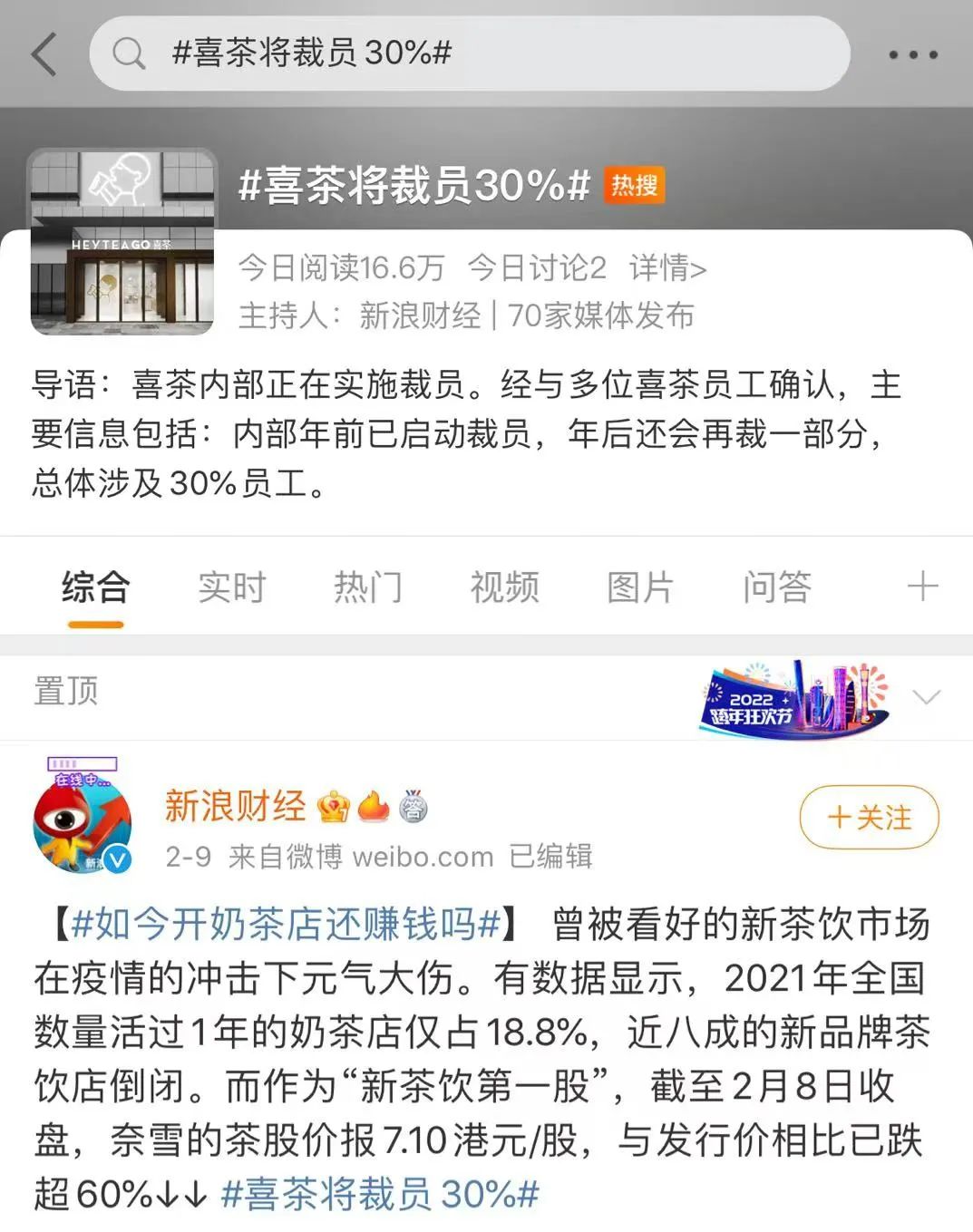 “喜茶裁员”上了热搜图源:微博