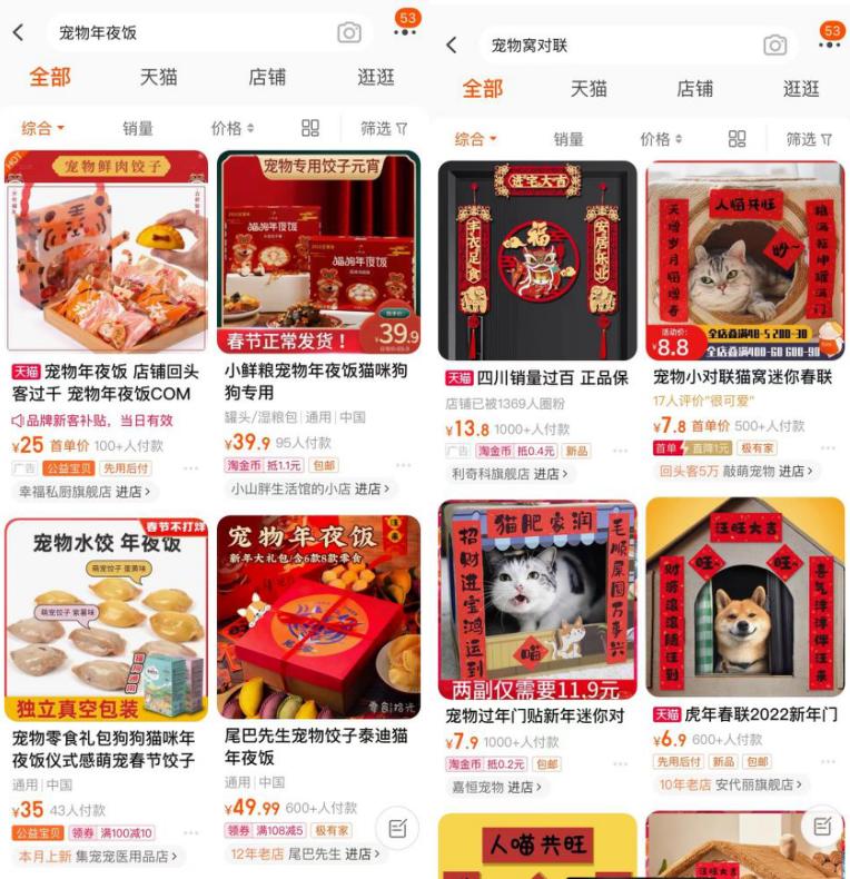今年春节期间,宠物年夜饭、宠物对联等产品在电商平台也非常火爆,以宠物年夜饭为例,价格在几十上百元不等,最高则近千元。