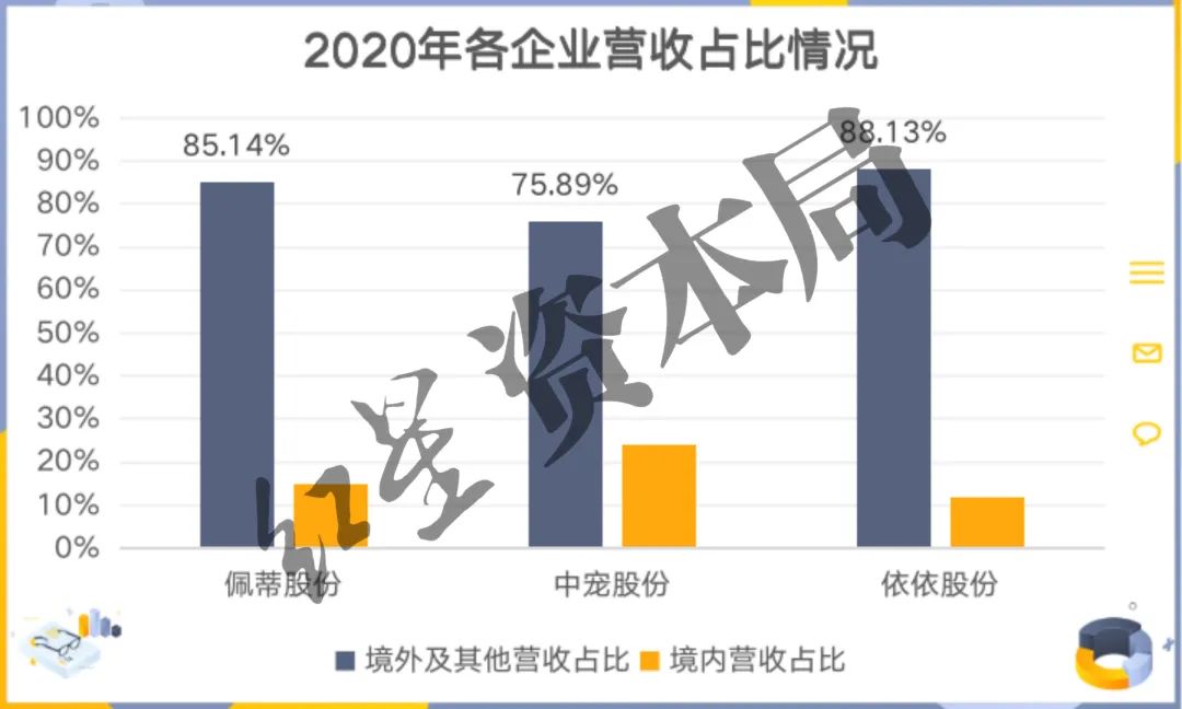 比如中宠股份在国内市场推出“Wanpy顽皮”、“Zeal真致”,在境外市场推出宠物零食品牌“Wanpy”、“Jerky time”、“Toptrees”;佩蒂股份则推出自有品牌好适嘉Healthguard、齿能ChewNergy、爵宴Meatyway、佩蒂、CPET等;依依股份推出的自有品牌为乐事宠(HUSHPET)。