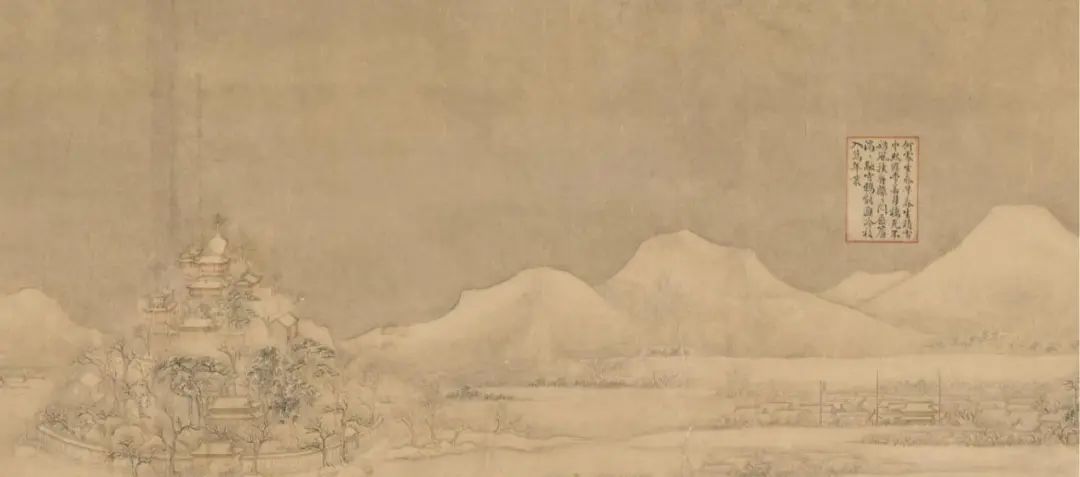 《生春诗》第一首位于画的东北方,旁边即景山,可见草木尚稀,山顶有一亭,两边各有两小亭