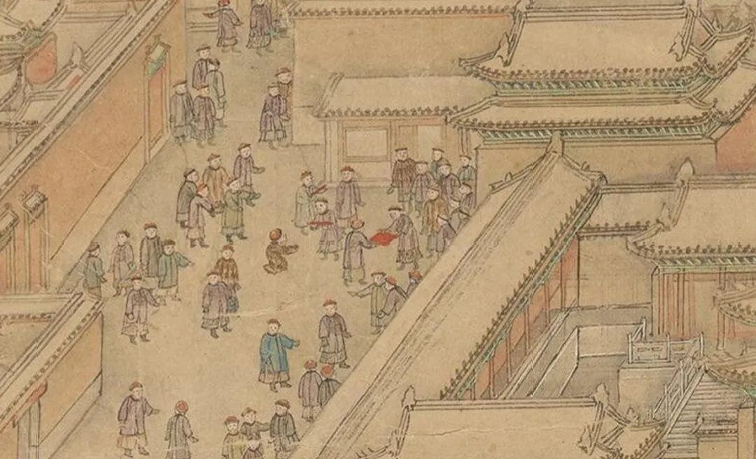 当我们放大画卷时,还可以看到重华宫外还有太监执红笺等候,这正是清朝皇帝写福习俗的体现: