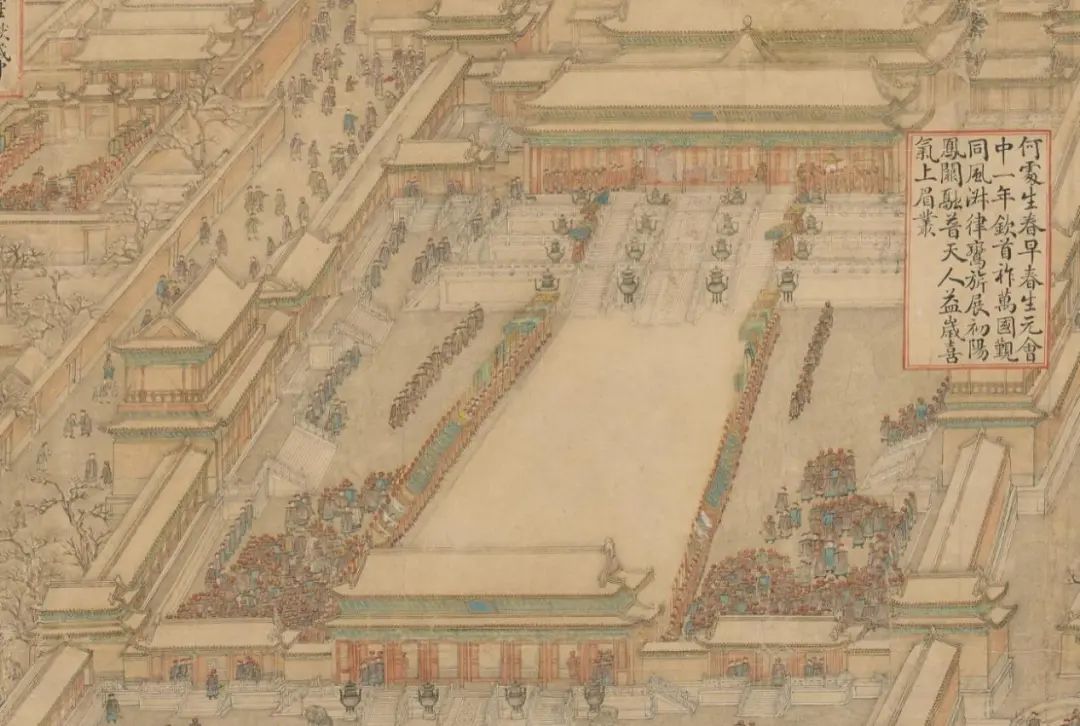 徐扬在绘制此画时为了配合乾隆的诗词,略去了一部分建筑,突出了重点。画中的神武门往下不远处便是太和殿,此时的太和殿内正在举行盛典,旁边的诗题道:“何处生春早?春生元会中。一年钦首祚,万国觐同风。”清朝正月初一要举行典礼,百官国亲都要觐见皇帝,向皇帝表示祝贺。画中的太和殿人影攒动,不管是殿内还是殿外,大臣都摩肩接踵,仪仗队则披红执彩,上下一派喜庆热闹的景象。