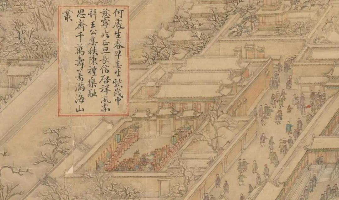 别看此时太和殿这么热闹,但乾隆本人并不在太和殿内,这可不是乾隆故意放大臣们的鸽子。按照规定,正月初一乾隆要来到长信门外、慈宁门内,率领百官国亲给太后行三跪九叩之礼。此时的乾隆就在太和殿旁的慈宁宫给太后行礼,画中的慈宁宫此时也是热闹非凡,中间那人即为乾隆皇帝。