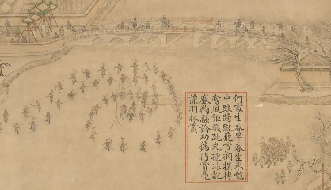 除了恭贺礼之外,诗画之间还描写了许多清朝岁时的皇家习俗,例如在紫禁城外的西苑太液池的中海就在举行清朝十分流行的冰嬉,“何处生春早?春生冰戏中”,乾隆还在自己写的《冰嬉赋序》中称冰嬉为国俗。画中的冰嬉还吸引了桥上的行人驻足观望。