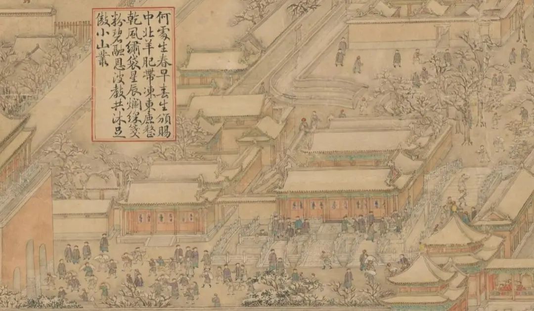 画面进入紫禁城中,乾隆爷的题咏多以皇家礼仪重典或者自己为主。进入紫禁城中能看到的第一首诗,乾隆爷写道:“何处生春早?春生书福中。迎年应蜡朔,施惠守家风。”“春生书福中”应该是指每年乾隆爷都要在农历十二月初一写福迎接新春的传统。