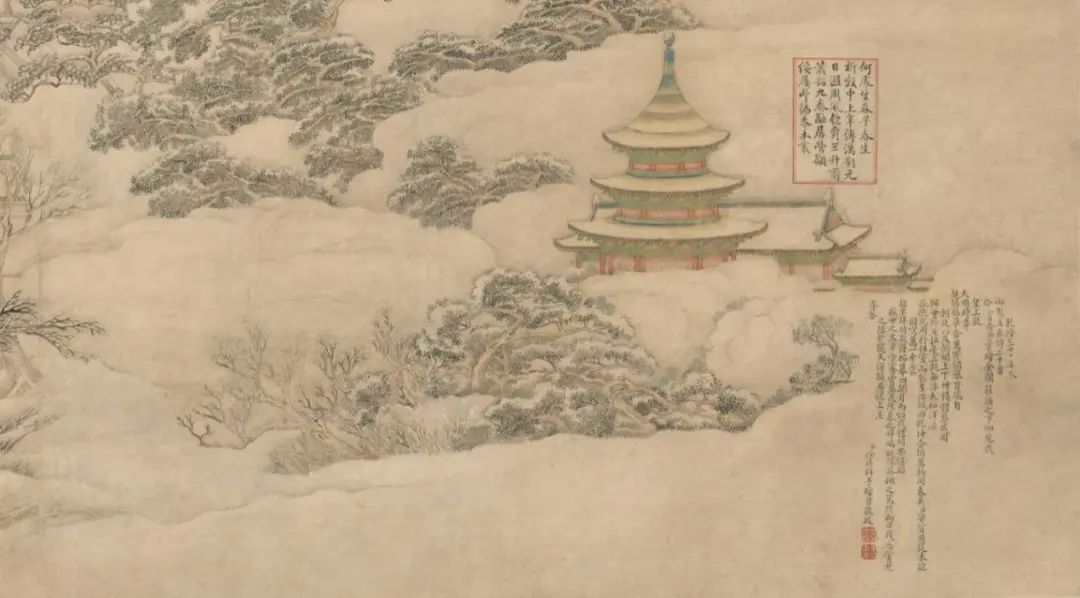 在画卷的右下角,还静静矗立着一座祈年殿,祈年殿的下半部隐于迷雾中,乾隆爷诗题为“何春生春早?春生祈谷中”。《大清会典》有载:“顺治元年定,每年正月上辛日,祭上帝于大享殿。”大享殿即祈年殿,清乾隆十六年改名为祈年殿,然而皇帝祭于祈年殿并非一定要在上辛日(每年正月的第一个辛日),也可以在次辛日和下辛日举行。