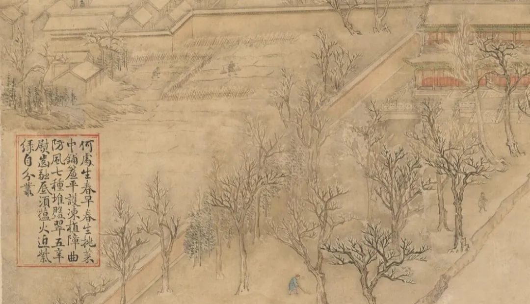 菜园位于西苑左侧,画中隐约可见两人正在田间劳作