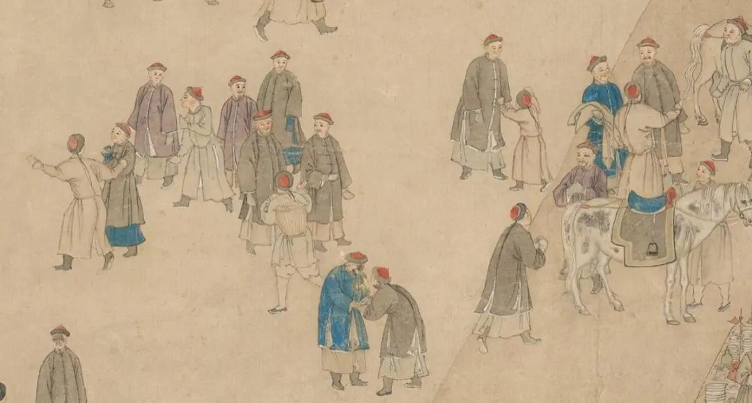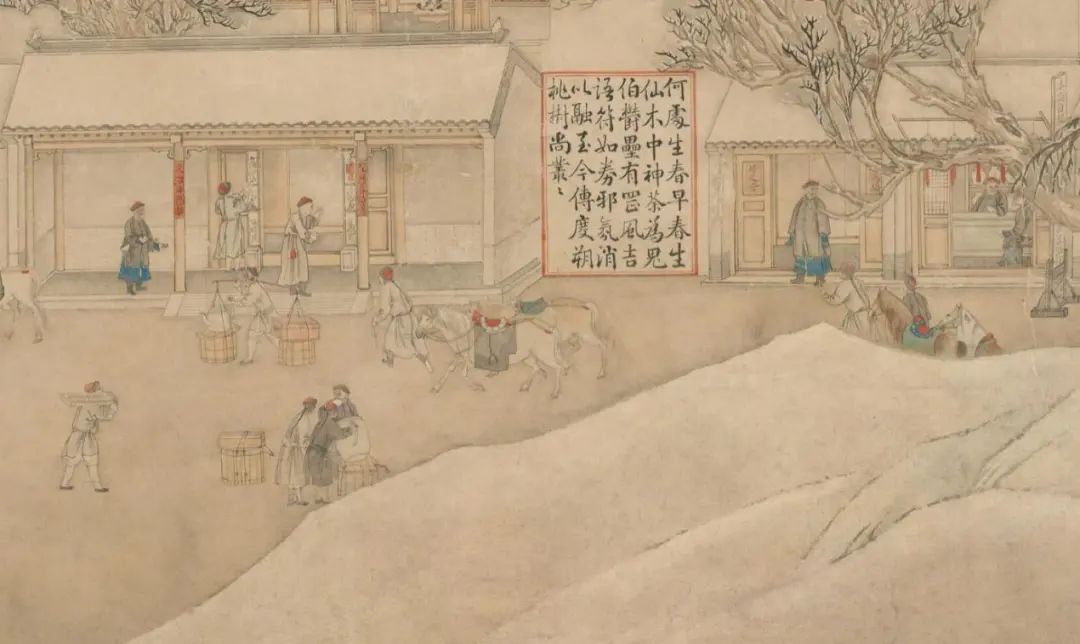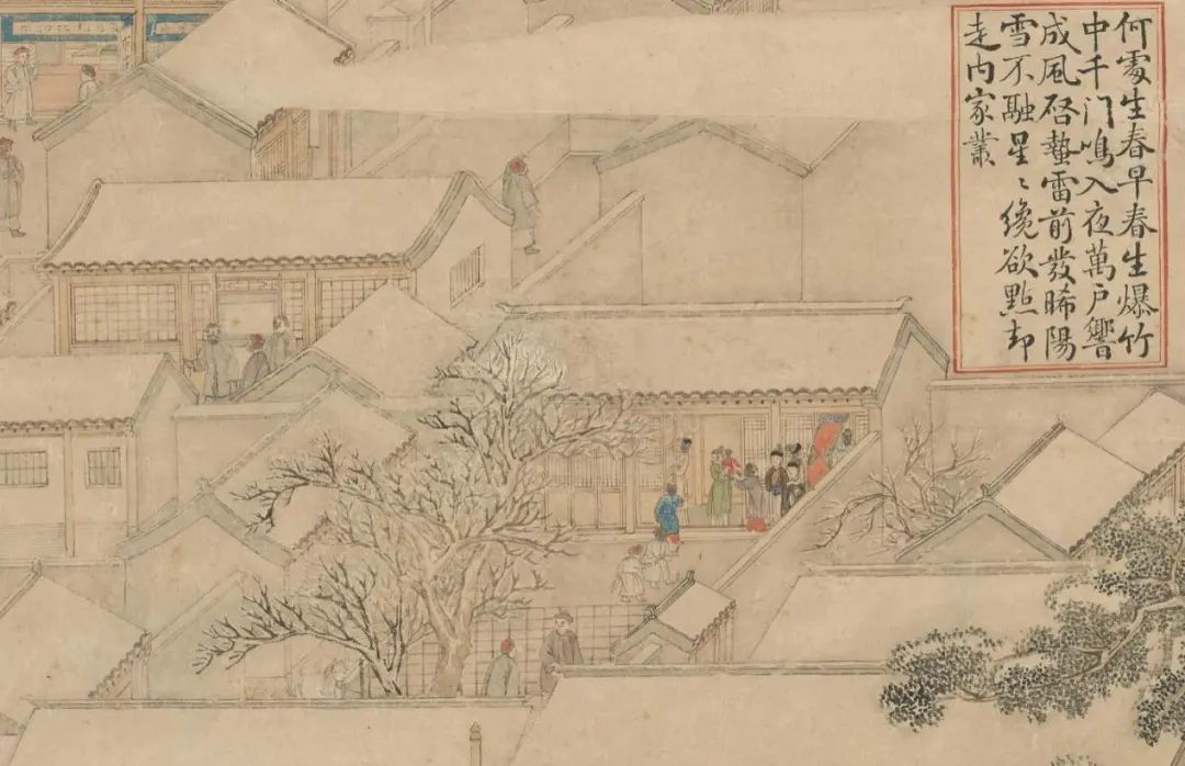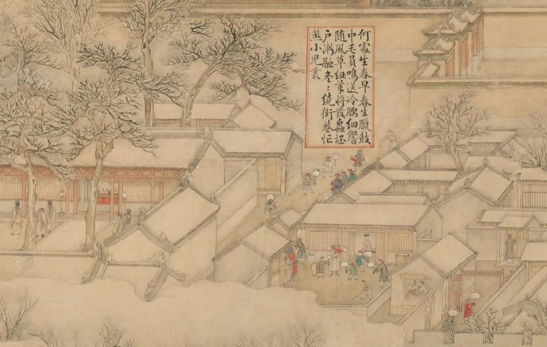 总而言之,《京城生春诗意图》其实就是一幅关于岁时正月里京城的风俗图。乾隆爷眼中的春是怎样的春?是万物复苏,潜入无声的春,所以艮指东风,寒梅绽放,白雪消融;也是百姓安堵,海晏河清的春,所以朝廷行礼典,民间庆新春。同时,里巷市井之间的烟火气也驱赶走了寒意。正如徐扬画中所呈现出的那一派春意融融。