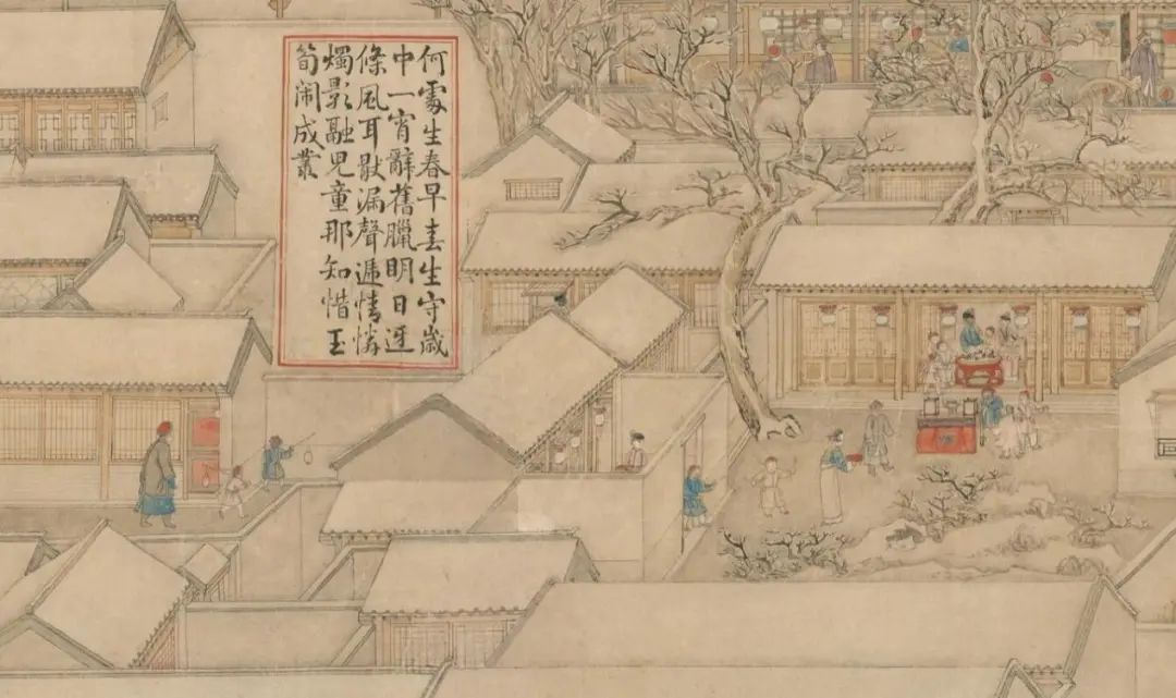 “春生守岁中”写的则是京城人家岁时守岁的习俗,在诗的下方我们可以看见一户子孙满堂,正在享受天伦之乐的人家,孩童满地走,父母高堂坐,院中还摆放着桌子与香火鼎,应该是要举办祭祖仪式。