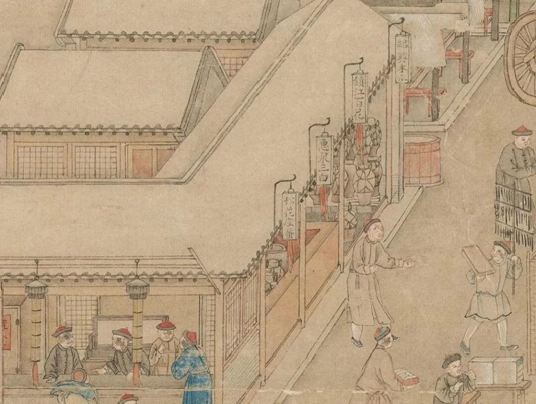 岁末时节,年货是必不可少之物,在正阳门前的大街两旁,充斥着各色商铺,挤满了置办年获的百姓。根据大街两旁商铺悬挂出的牌子我们得知,这些店铺分别有卖“金华火腿”“松花皮蛋”“干鲜果品”“苏州杂货”“镇江百花”等等,小小的正阳门大街,汇集了天南海北的货物。