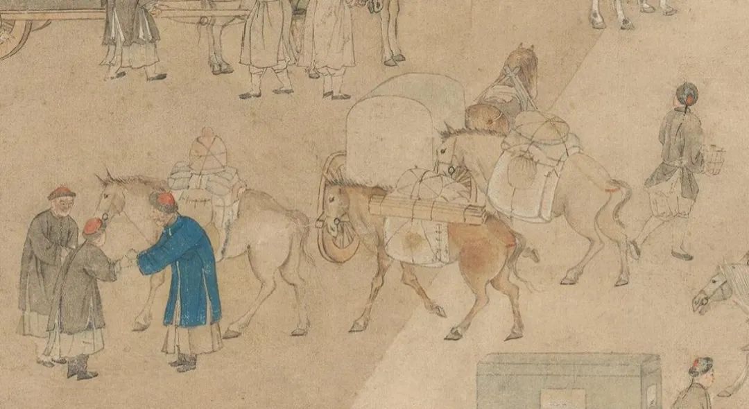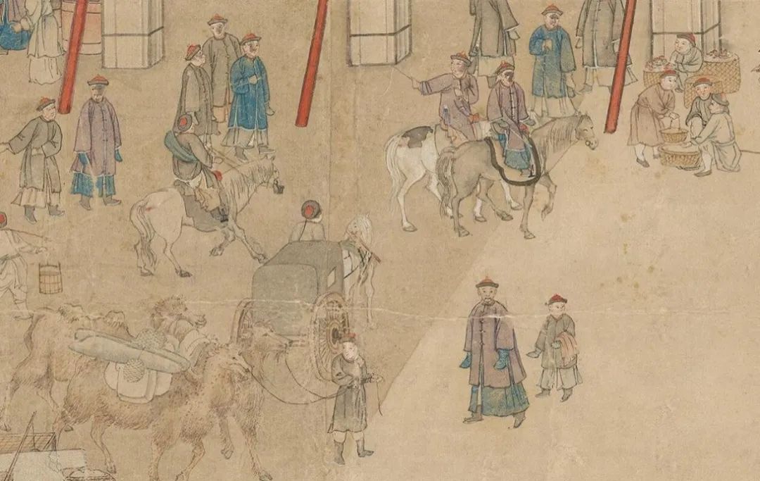 行走在正阳门大街上的人也是姿态万千,人生百态,有骑马者,有赶车者,有牵骆驼者,还有互相寒暄拜年者: