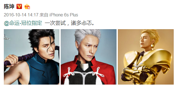 网友过去调侃陈坤是横跨二三次元的男人,还P了很多他的照片广为传播,没想到去年陈坤出任《Fate/Grand Order》国服代言人,堂堂正正地玩起了COSPLAY。