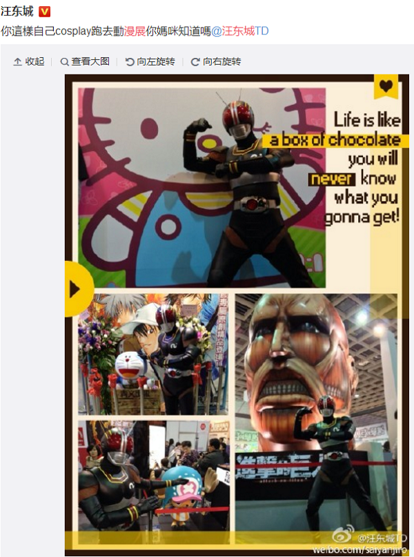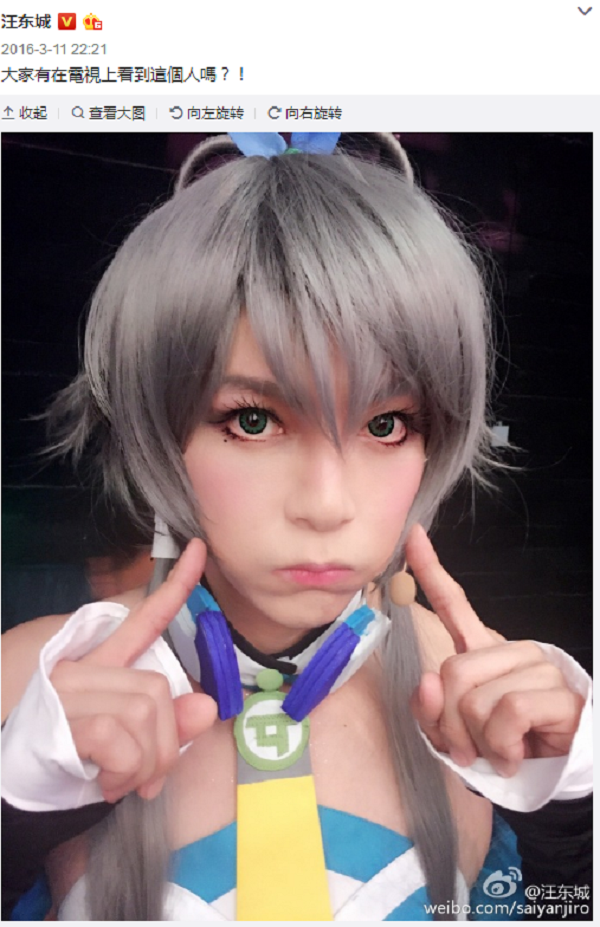 和徐娇一样也对二次元情有独钟的要数汪东城,2014年10月他被网友发现私下逛漫展,于是上传了自己参展的照片,不仅没掉粉还涨粉。