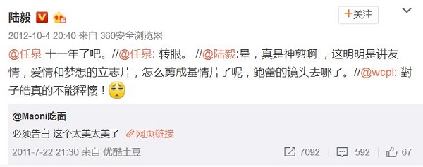 陆毅和任泉转发点评网友制作的同人视频“神剪啊,怎么剪成基情片了呢”(指路B站623895)。
