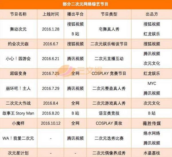部分二次元网络综艺,图源知乎专栏“三文娱”比如图表中笔者唯一看过的网综、次元文化出品的《二次元大作战》,节目模式就是运用时下综艺节目最常见的“接任务闯关打boss”,嘉宾以声优、舞见、唱见、演员、次元文化签约Coser等人为主,节目的投资和宣传力度都很有限。