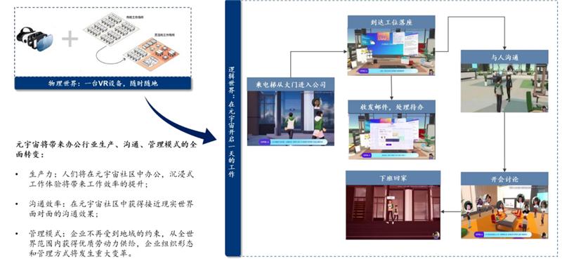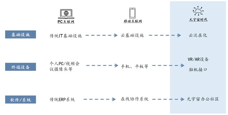 ▲数字化办公行业发展历程元宇宙时代,工作形态将发生转变,人们将能够随时随地进入办公室,在一个 有“虚拟形象”的 3D 空间开展一天的工作。在此情境下,企业生产、沟通、协作三个维度均有望实现进化:沉浸式的工作体验将带来工作效率及创造力的提升;元宇宙社区中的沟通有望接近现实世界面对面的沟通效果;企业雇佣的员工遍布世界各地,全球化协作促使其组织形态和管理方式变革。