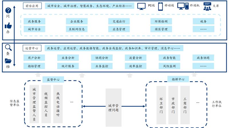 ▲城市管理维度从管人向管物延伸监管主体:经历技术驱动-政府主导-社会共建三个阶段,更考验政府的统筹能力。随着城市化进程的加快,城市管理的方式也在发生变迁。过去在探索期,主要依靠大型技术公司通过 IT 技术集成解决城市运营垂直领域问题。步入 2010 年之后,政府侧重于基于城市发展需求整体规划部署,以此来提高城市运营管理质量。而目前,城市服务更倾向于政府引导,引入公民、企业参与城市建设,通过打通问、办、查、档四个步骤实现服务高效。