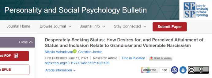 这项研究于2021年发表在Personality and Social Psychology Bulletin(人格与社会心理学公报)上,文章名为“Desperately Seeking Status: How Desires for, and Perceived Attainment of, Status and Inclusion Relate to Grandiose and Vulnerable Narcissism”,中文译作“拼命寻求地位:对地位和包容的渴望和感知成就如何与浮夸和脆弱的自恋有关”。研究人员Nikhila Mahadevan来自英国埃塞克斯大学,Christian Jordan来自加拿大威尔弗里德·劳里埃大学。