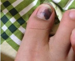 多见于创伤后,如长时间跑步、走路后造成的甲下出血。常见于第一足趾内侧,表现为不规则甲板下紫红色或红蓝色斑片,陈旧性出血可呈黑色斑片,有时可见散在性短小线状或散在性点状出血斑。出血较多又不能及时排出时,可继发甲营养不良或甲板脱落。可发生于任何年龄,拇指和拇趾相对多见。外伤严重时,痛疼明显的比较容易辨别。