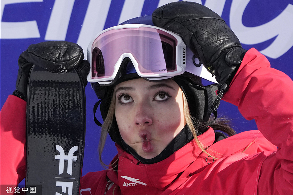 2月15日,河北张家口,完成第一跳后,谷爱凌噘嘴等分数的可爱瞬间。