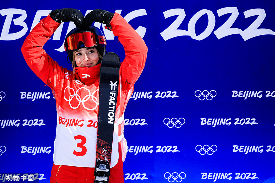 2月15日,河北张家口,顺利完成第三跳动作后,谷爱凌比心。