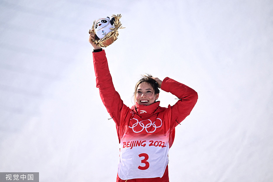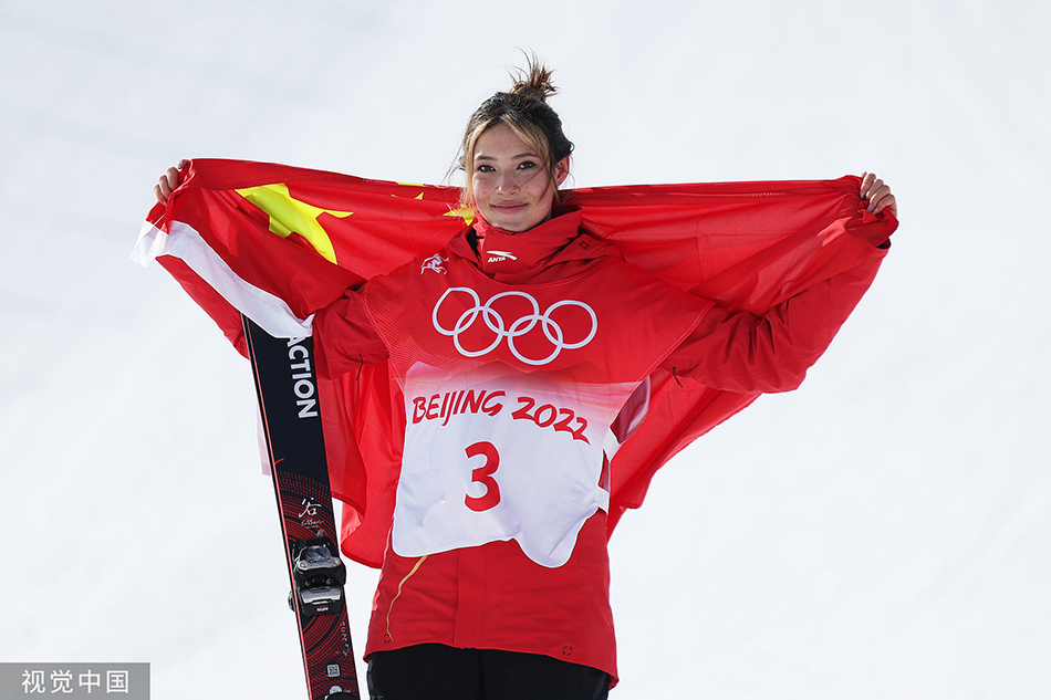 2月15日,河北张家口,谷爱凌披上五星红旗庆祝摘银。