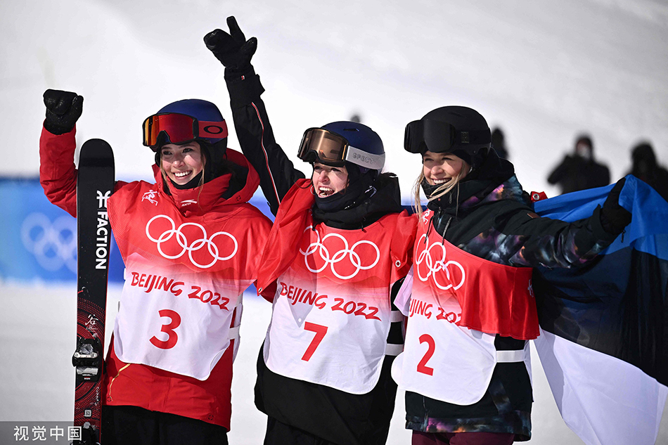 2月15日,河北张家口,自由式滑雪坡面障碍技巧决赛,金银铜选手合影。