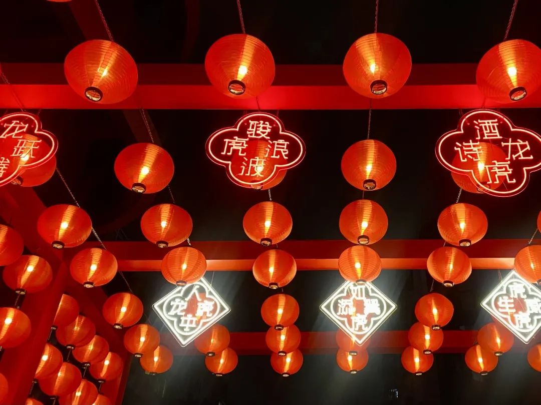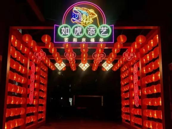 当晚六时许,暮色降临,灯塔变得更美了。远远望去,仿若一架彩色的拱桥,让人仿佛穿越到了一场盛唐灯会。灯塔由近300个灯笼组成,上面还悬挂了“龙腾虎跃”“酒虎诗龙”“人中龙虎”等与“虎”有关的成语祝福,给大家讨一个虎年的好彩头。