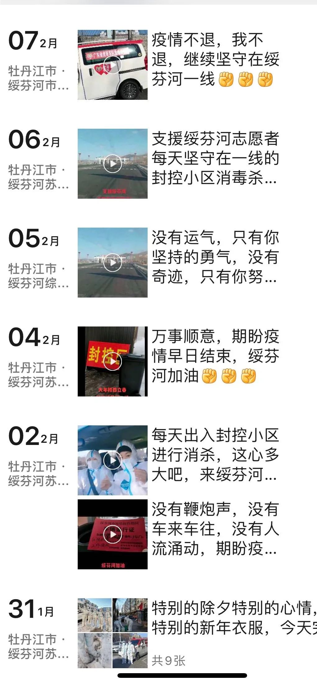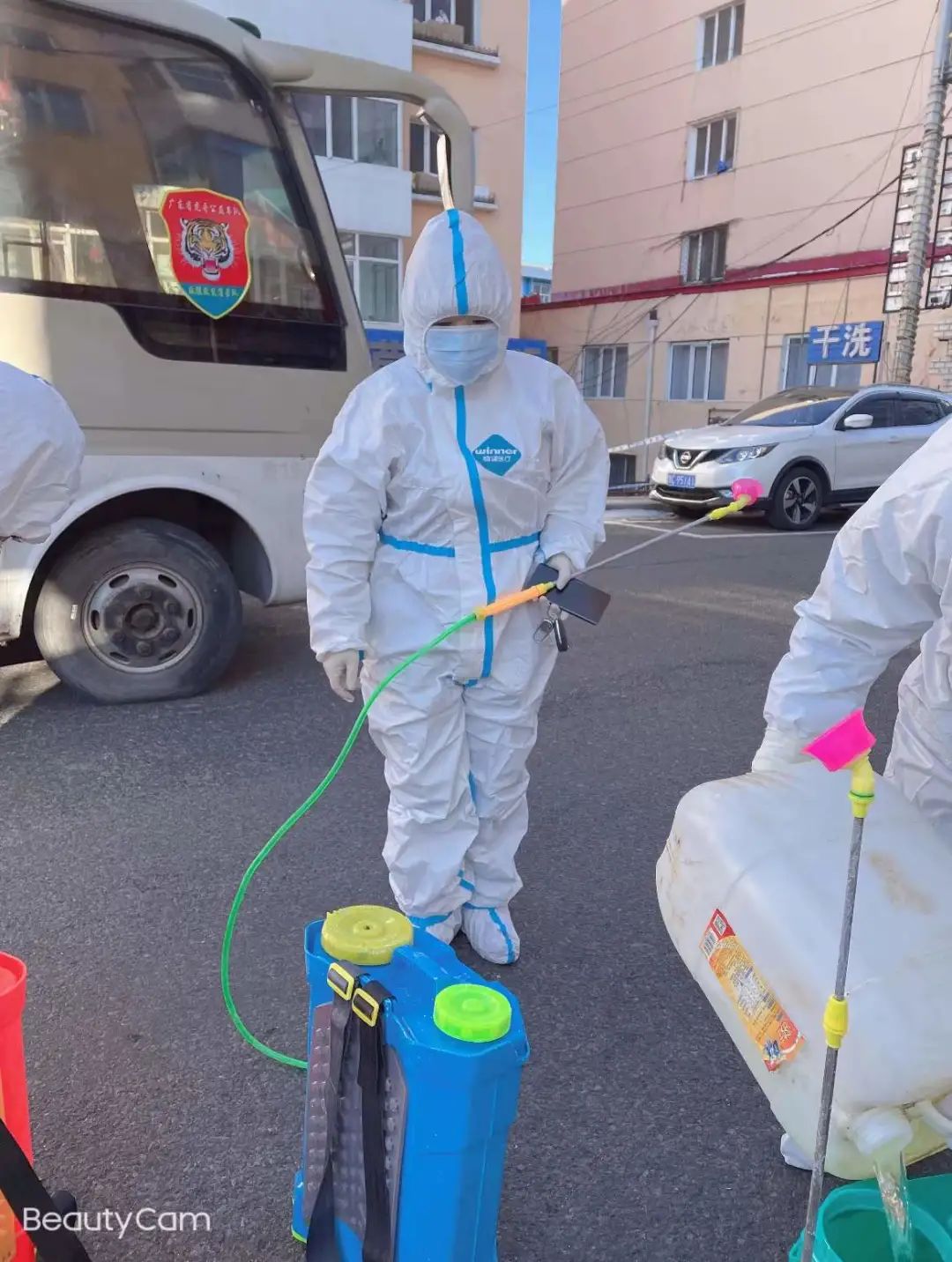 进入绥芬河,刘琳淋与来自四面八方素不相识的志愿者共同组建消杀队伍,立刻投入到消杀工作中。除夕那天,对绥芬河17个小区进行了彻底的消杀。工作结束,没有亲人团聚,没有丰盛的年夜饭,周围弥漫着危险而又冷清的气息,大家围坐吃顿便餐,饱含热泪为彼此加油打气,共同迎接疫情散去和春天。