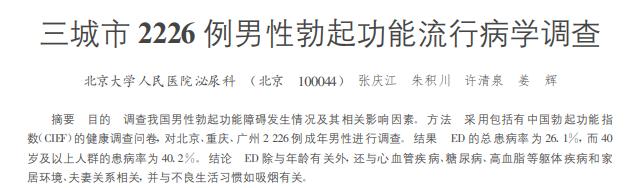 根据一份涉及北京、重庆及广州 3 个地区城镇的、不太大的调查报告显示:这三个地区被抽中的成年男性中,ED 总患病率为 26.1%,40 岁之后患病率达到 40.2%。