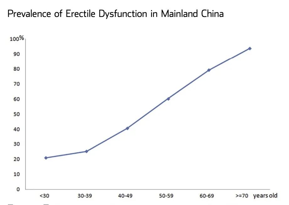 ED 本身是一种与年龄密切相关的疾病。随着年龄的增长,雄激素水平的不断下降,心血管疾病发生率也在升高,种种因素共同促进这 ED 的发生。70 岁以上男性的发病率可达 70%~100%。