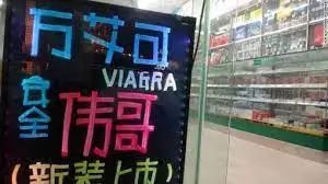 图片备注:很多药房门口都摆着「伟哥」的荧光色广告牌。坊间也流传:三人行,必有伟哥消费者。图片来源:网络