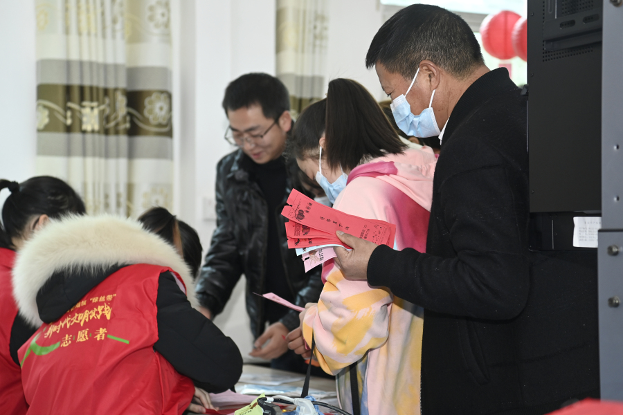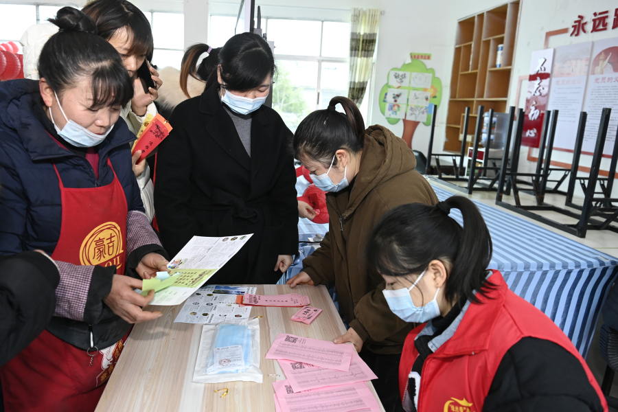 答对谜语的居民领取兑奖券和宣传品
