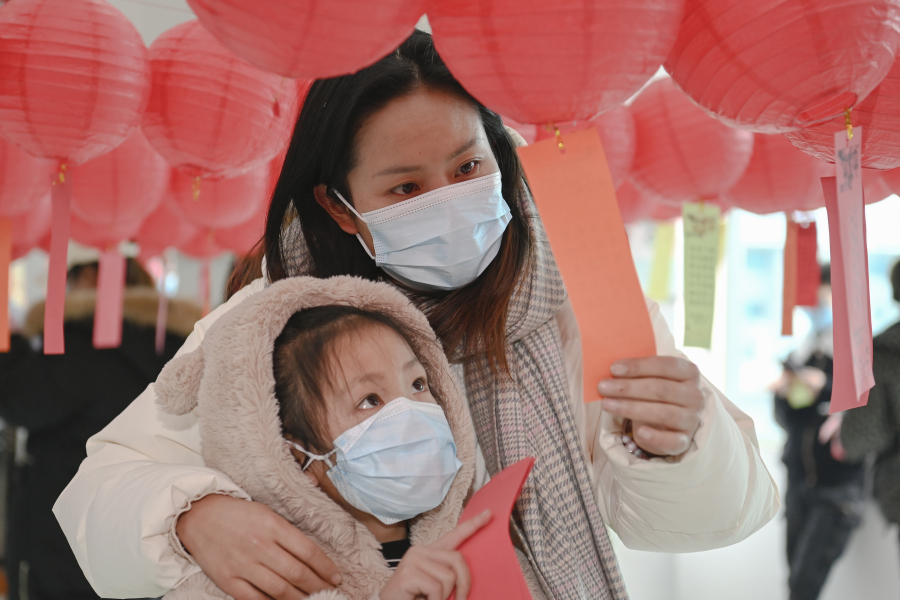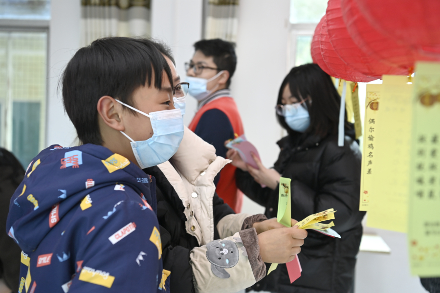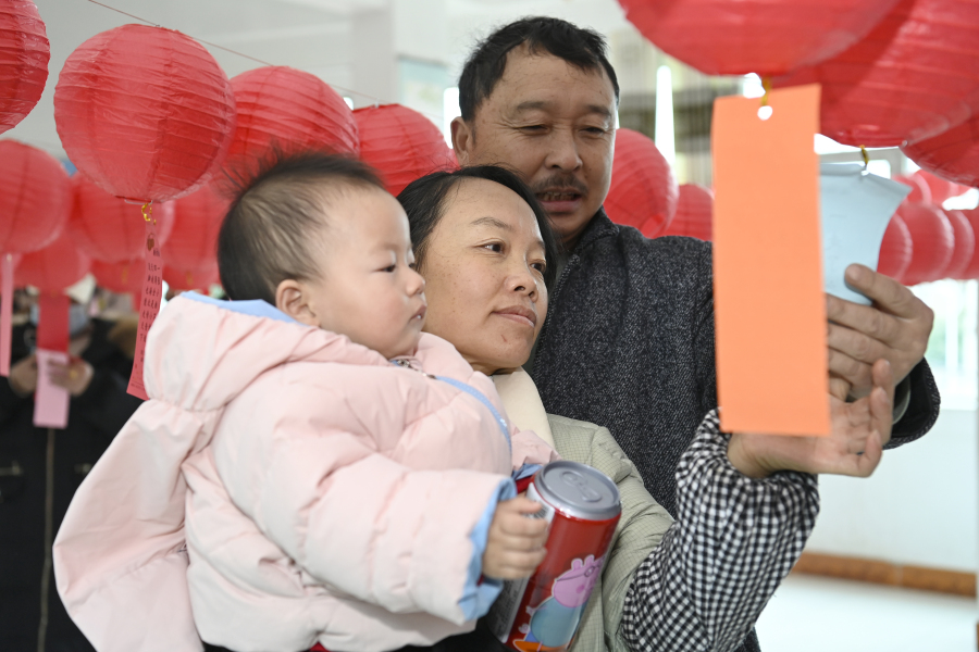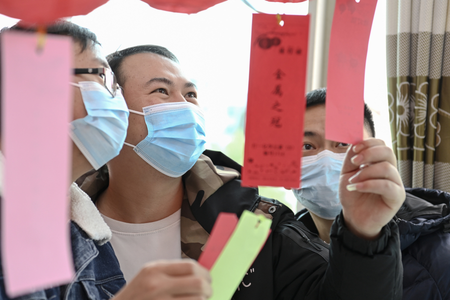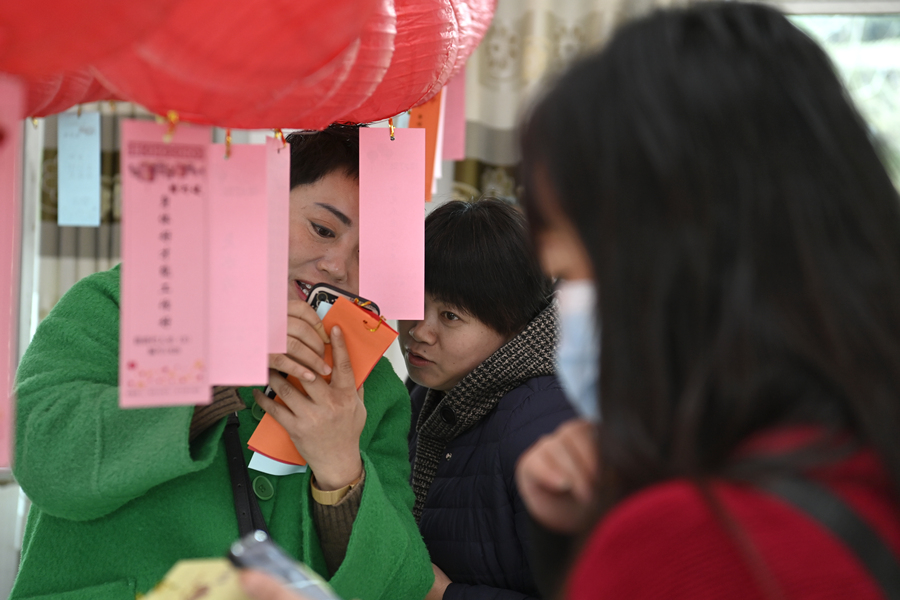 参加活动的男女老少认真思索灯谜