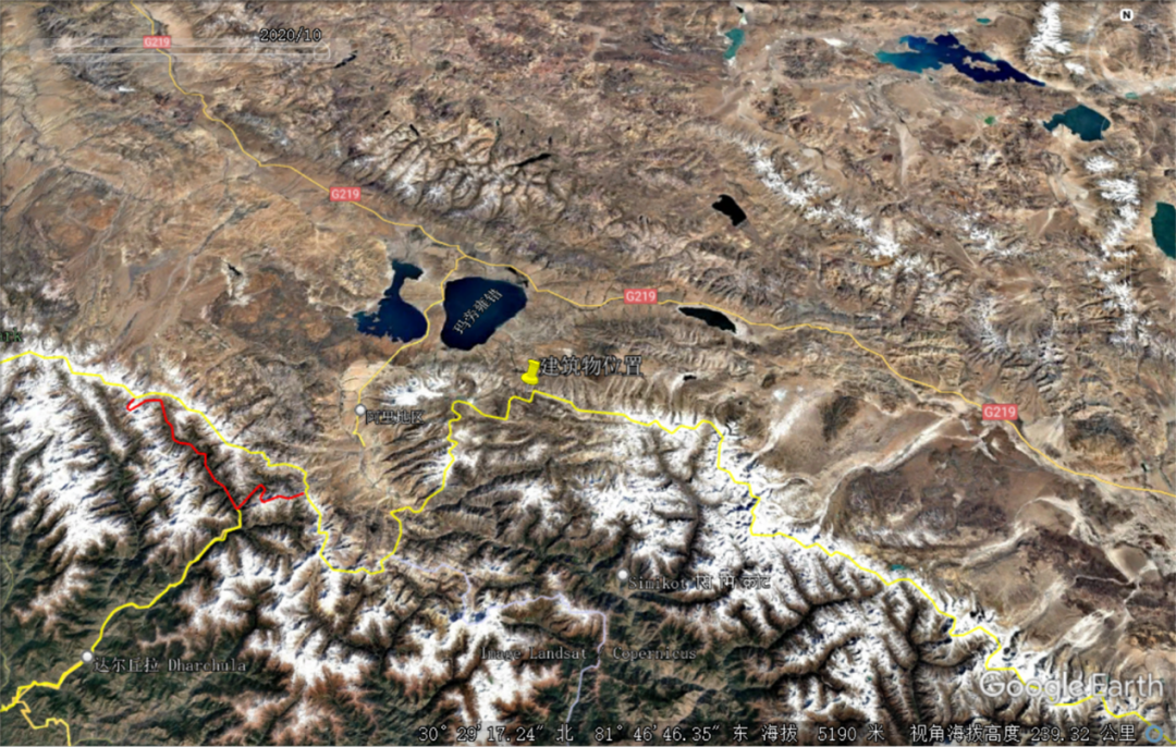 在谷歌地球上搜索尼泊尔胡姆拉县附近地区,则可以在玛法木错湖的支系和呼那卡那里河支系的分水岭附近的东经81°36’30.03’’,北纬30°26’03.88’’左右位置找到一组灰白色建筑物,其具体数量难以分辨。但可以确定的是,将相关地图的比例尺缩小后,可以看到这些建筑物在谷歌地球上被标识的位置在中尼边界线北侧,也就是中国的领土范围内。