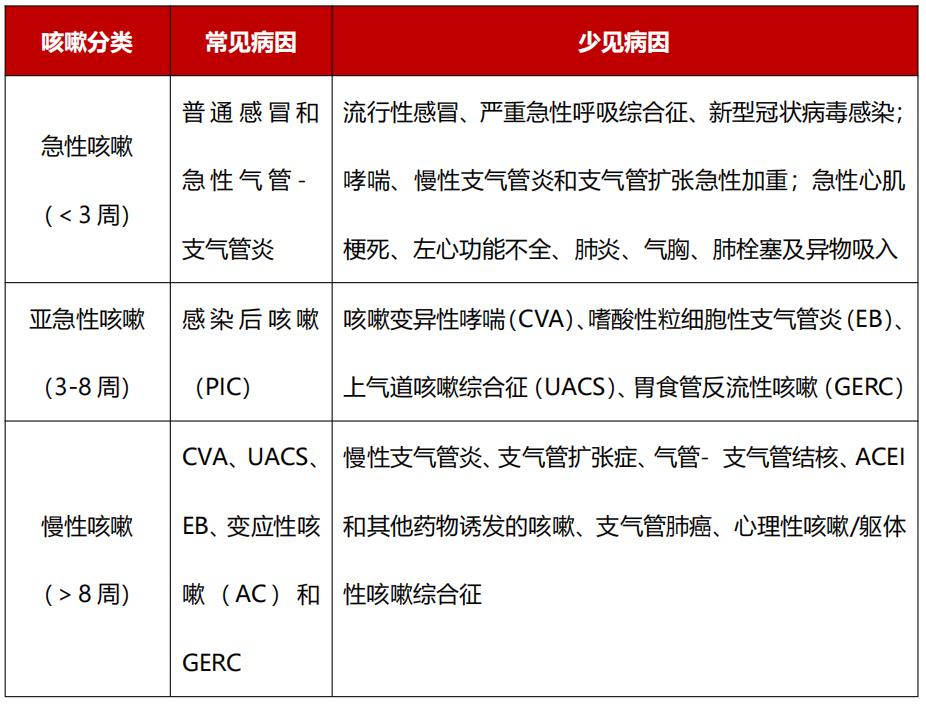 咱们还得从咳嗽的常见病因出发,表1总结了急性、亚急性以及慢性咳嗽的常见病因和少见病因。从中可以看到,感染性咳嗽在急性咳嗽中更为常见,而在亚急性和慢性咳嗽中较为少见。