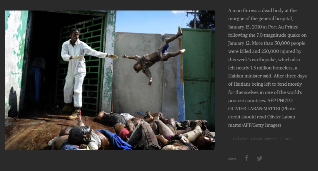 通过图片反搜可知,左上图片实为2010年1月海地地震期间,太子港综合医院工作人员处理在地震中丧生的孩童尸体。图片来源于法新社。