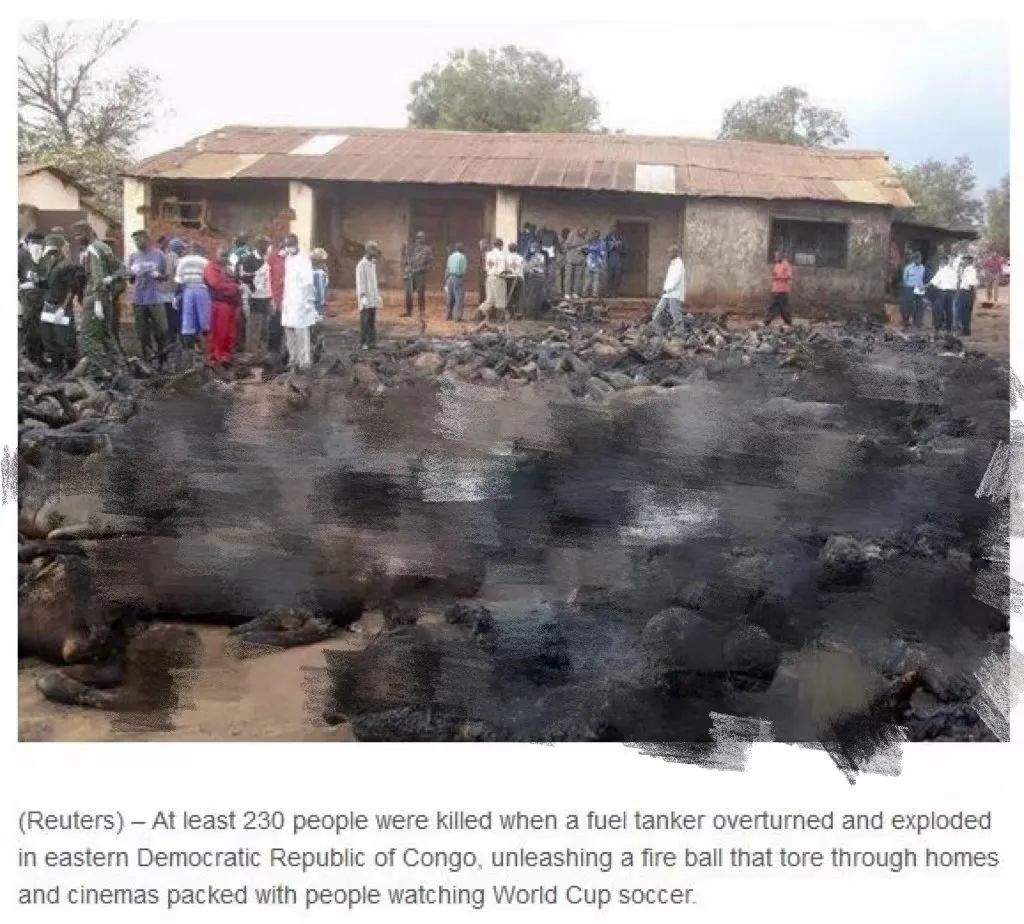 右上数百具烧焦尸体的照片实际摄于2010年的刚果民主共和国南部基伍省的桑格村(Sange)附近。由于交通事故,一辆油车倾覆,不少当地村民试图偷油,但油箱爆炸,造成230人死亡,数十人受伤。该事件曾为路透社所报道。