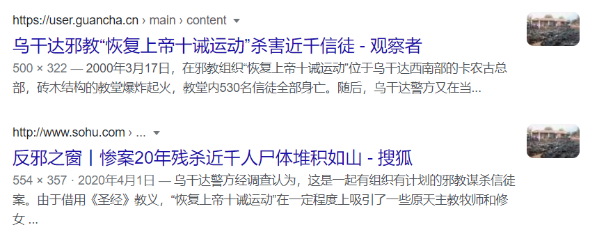 值得注意的是,这张图片不仅在后续传播中被作为缅甸佛教徒屠杀当地穆斯林的“证据”,有时还被挪用示意“恐怖组织博科圣地(Boko Haram)在尼日利亚焚烧基督徒恶行”,一些中文自媒体文章则将其错误地当作2000年乌干达邪教“恢复上帝十诫运动”(Movement for the Restoration of the Ten Commandments)纵火现场图。这些均为对该图片的误传和误用。