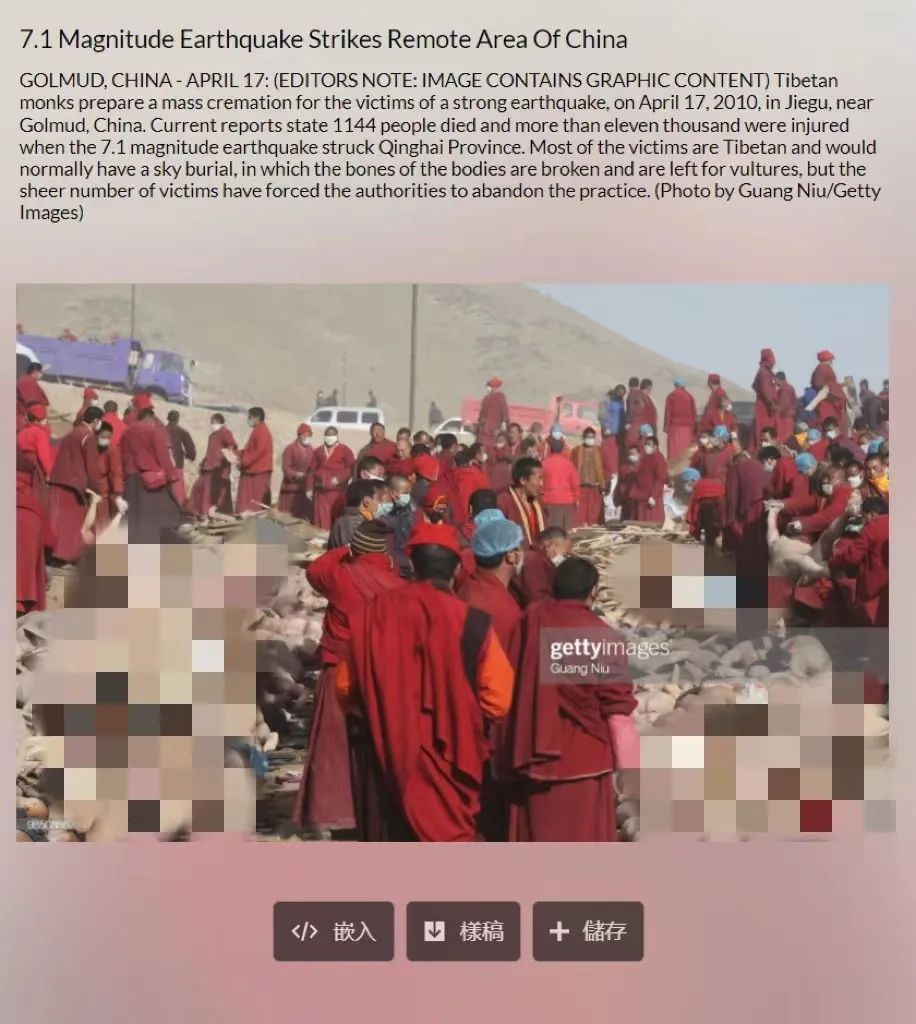 左下图片中的僧侣身着藏传佛教僧袍,与缅甸当地僧侣服饰有明显出入。反搜可知,该照片被图片社Getty Images所收录,摄影师为牛广(音),反映的是2010年4月青海玉树地震后遇难者举行集体火葬的场景。