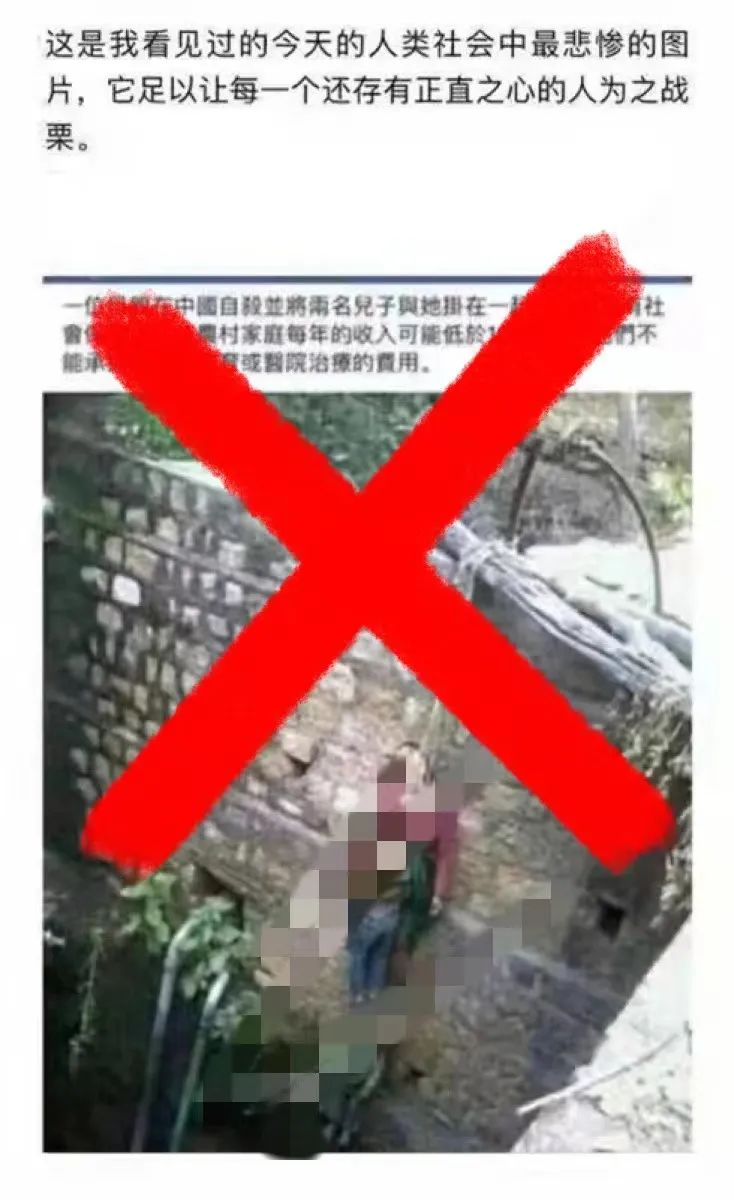 社交平台上流传一张图片,有网友声称,这张图片中的一位中国母亲因“没有社保”“无力承担孩子教育或医疗费用”而带着两名儿子一起上吊自杀。