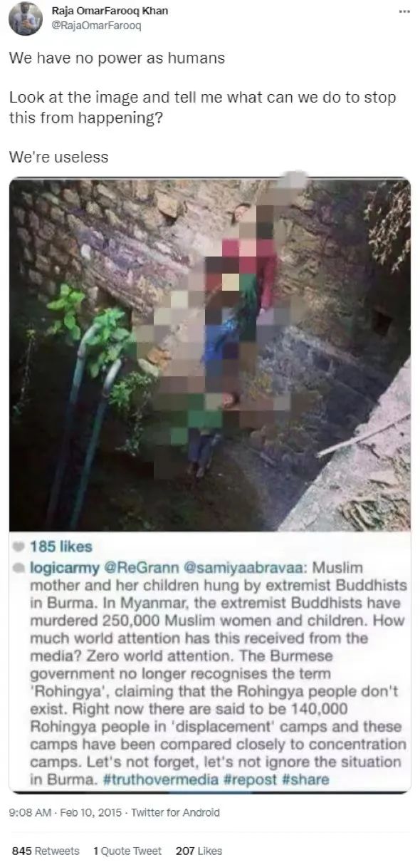 - 除用以抹黑中国外,该图还被用来描绘缅甸境内针对穆斯林的暴力。但是推特上关于这一事件的图片常常有误导性,需细加甄别。