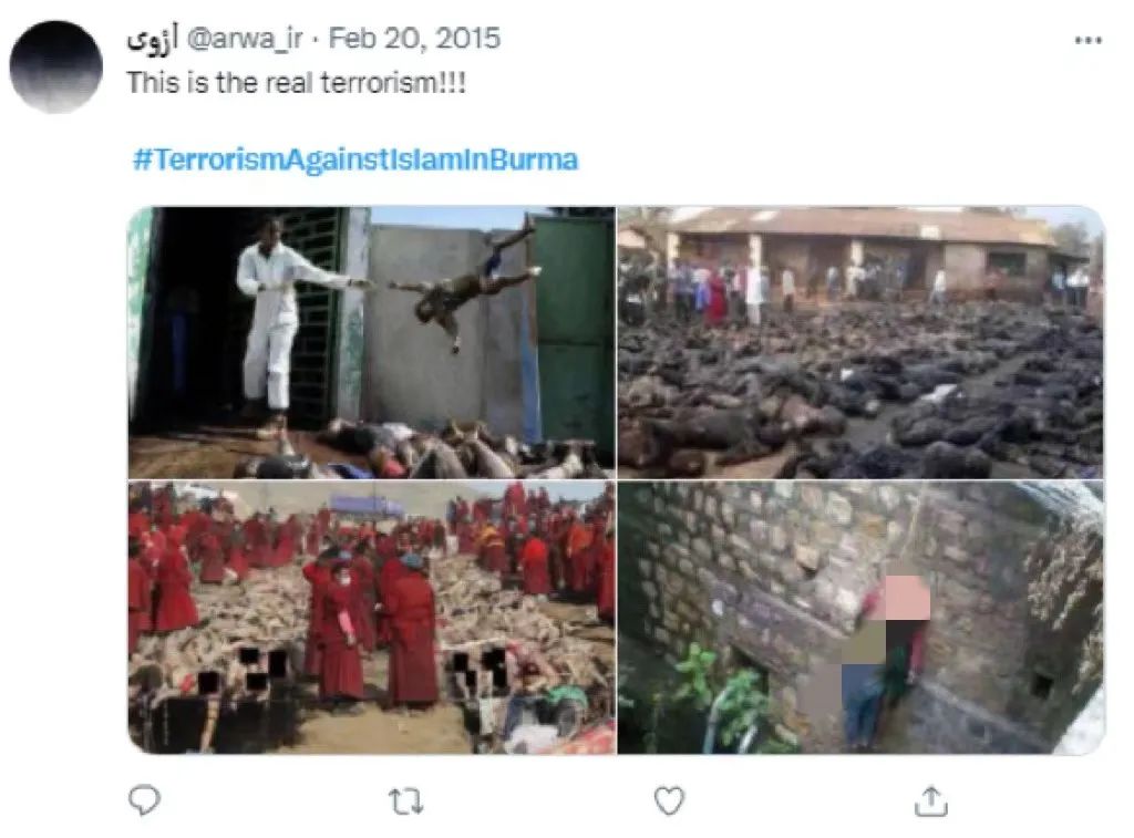@arwa_ir在“针对缅甸伊斯兰的恐怖主义”话题标签下的推文,引用了多张未经证实的照片。