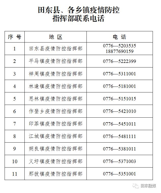 百色市田阳区、各乡镇疫情防控指挥部联系电话
