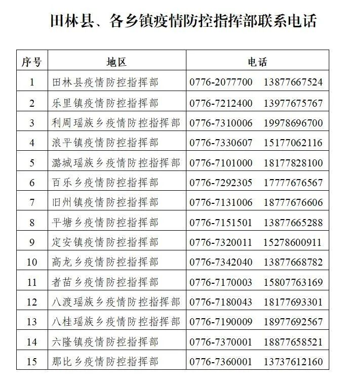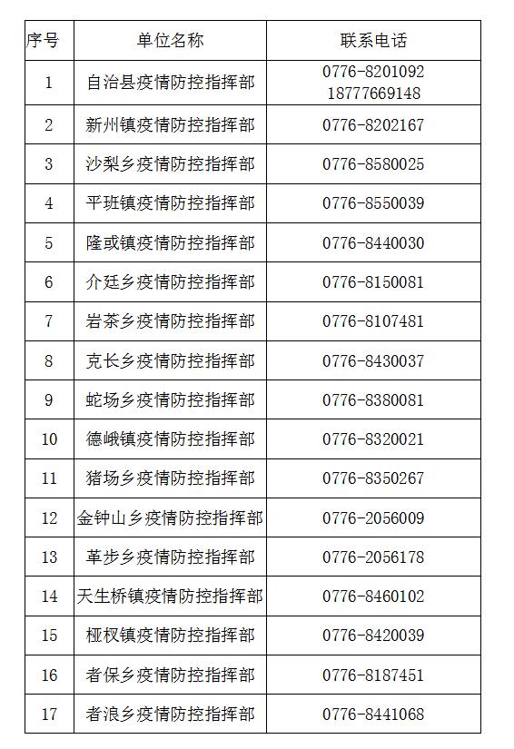 隆林各族自治县、各乡(镇)疫情防控指挥联系电话