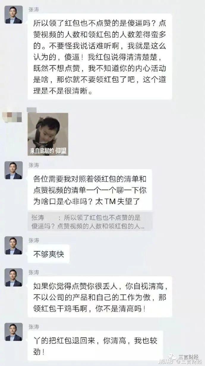 从群聊语气可以看出,张涛用词非常激烈,说明他的确很生气。还强调如果员工觉得点赞丢人,不以公司产品和自己工作为傲,那么为何领红包。还要求大家把红包退回,“你清高,我也较劲”。