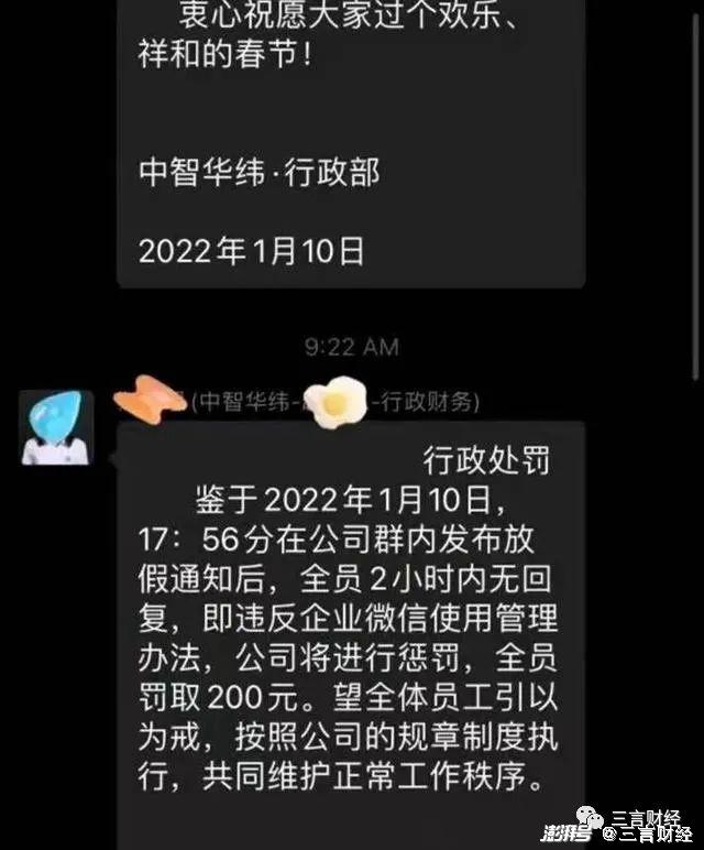 近日,根据网传截图显示,广东广东中智华炜管理咨询有限公司发布一条行政处罚消息称,鉴于2022年1月10日17时56分在公司群内发布放假通知后,全员2小时内无回复,即违反企业微信使用管理办法,公司将进行惩罚,全员罚取200元。