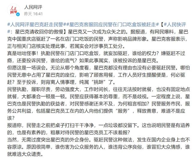 对此,人民网在《星巴克请收回你的傲慢》一文中表示,但愿这是一场误会。无论从哪个角度看,星巴克都没有理由也没有必要驱赶民警。哪怕民警无意中占用了星巴克的座位,影响了顾客用餐,工作人员好生提醒便是,何必驱赶?至于投诉,则背离人情事理,纯属“挑衅”了。并指出,无需过度突出星巴克的外企身份。驱赶民警这种做法,发生在国内企业身上也不容原谅。