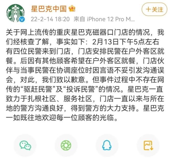 2月14日下午,@星巴克中国 发文道歉称,经核查了解,2月13日下午5点左右有四位民警来到门店,门店安排民警在户外客区就餐。